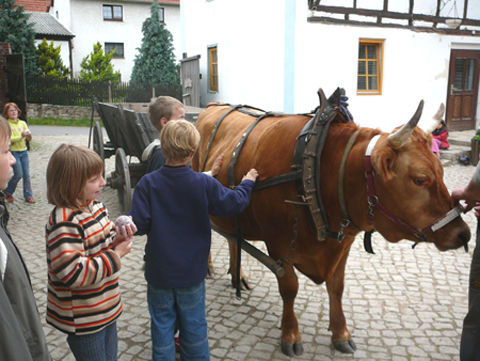 Ein Ochse vor dem Wagen.Während früher auf der Hainleite nur wenige Bauern ein Pferdegespann hatten, kennt jetzt kaum noch jemand einen Ochsenwagen. Unsere beiden Ochsen Bruno und Hector können nach traditioneller Art mit Kummet und Ackerwagen auch mal ordentliche Lasten bewegen.