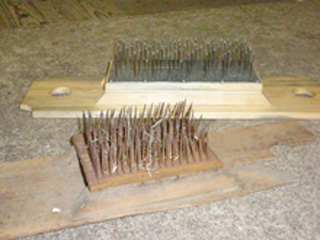 auf dem Bild oben ist ein Hechel aus dem Bestand unseres Museums und ein von uns nachgebauter dargestellt. Früher wurden die Nadeln aus speziellem Stahl geschmiedet, wir haben bei unserem Nachbau einfache Stahlnägel benutzt, was sicher nicht ideal ist, aber doch erst einmal seinen Zweck erfüllt. Die Nadeln sind etwa 35 mm lang.