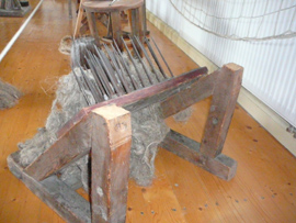 hier ist der Rest ein Hechelbocks aus dem Seilermuseum Schlotheim zu sehen. Die Hechel werden normalerweise auf solch einem Bock angebracht, durch die Neigung (ca. 45°) wird die Verletzungsgefahr beim Hecheln wesentlich herabgesetzt und die Standfestigkeit erhöht. Trotzdem bleibt das Hecheln eine gefährliche Arbeit. Beim Hecheln innerhalb des Hanfprojektes sollen die Jugendliche unter ständiger Beaufsichtigung sein, um Leichtsinn zu vermeiden.