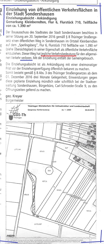 was aber die zuständigen Stellen der Stadt Sondershausen nicht weiter störte. Jetzt allerdings wird das Handeln der Stadt völlig absurd, sie will den ganzen Wegabschnitt einziehen, so dass er von niemand mehr genutzt werden kann.
