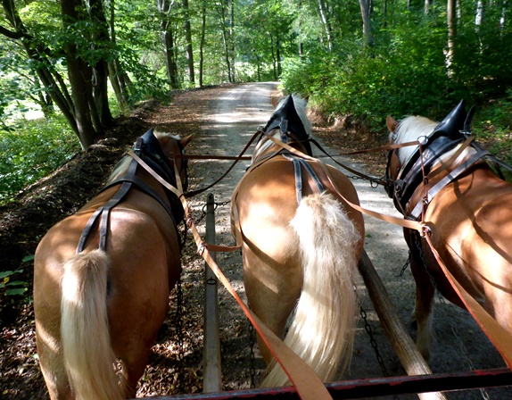 können. Auf ihm ist Platz für etwa 15 Personen. Diese Zahl an Fahrgästen schaffen unsere Haflinger aber nur zu dritt durch die hügelige Landschaft. Dann